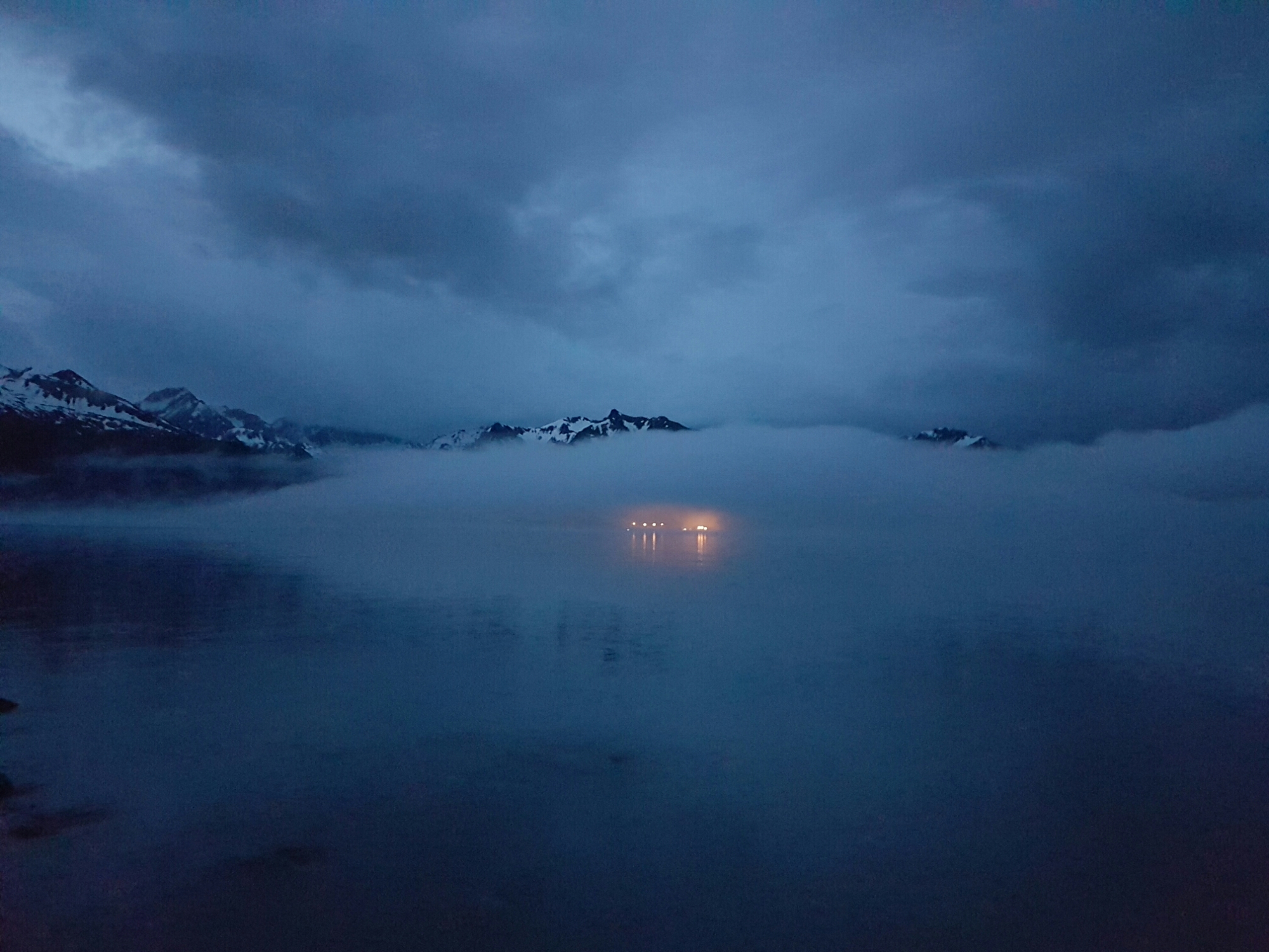 וערפל הלילה רוכב על המים השקטים של הפיורד ב Seward